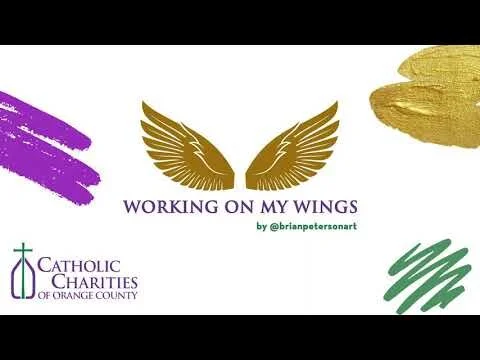 The installation of this mural is at Cantlay Food Distribution Center. Throughout the pandemic, they've served around 200,000 people, up tenfold since before the pandemic began. This wall will serve as a place where volunteers can share a photo, promoting the great work happening within these walls. The mural features wings that are captured in a way that makes them look like solid gold.